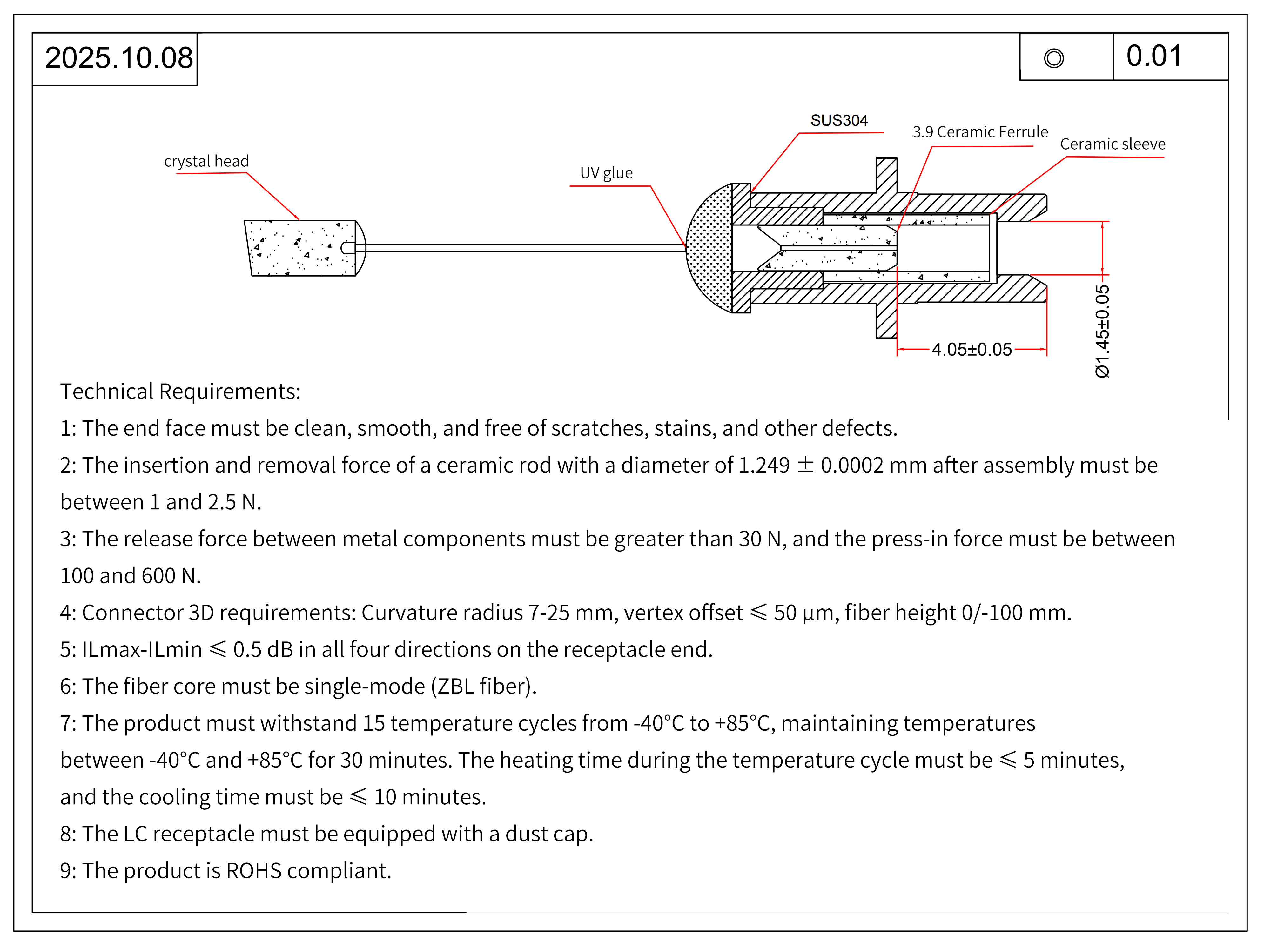 2. After assembly, the insertion and removal force of a ceramic rod with a diameter of 1.249 ± 0.0002 mm must be between 1 N and 2.5 N.