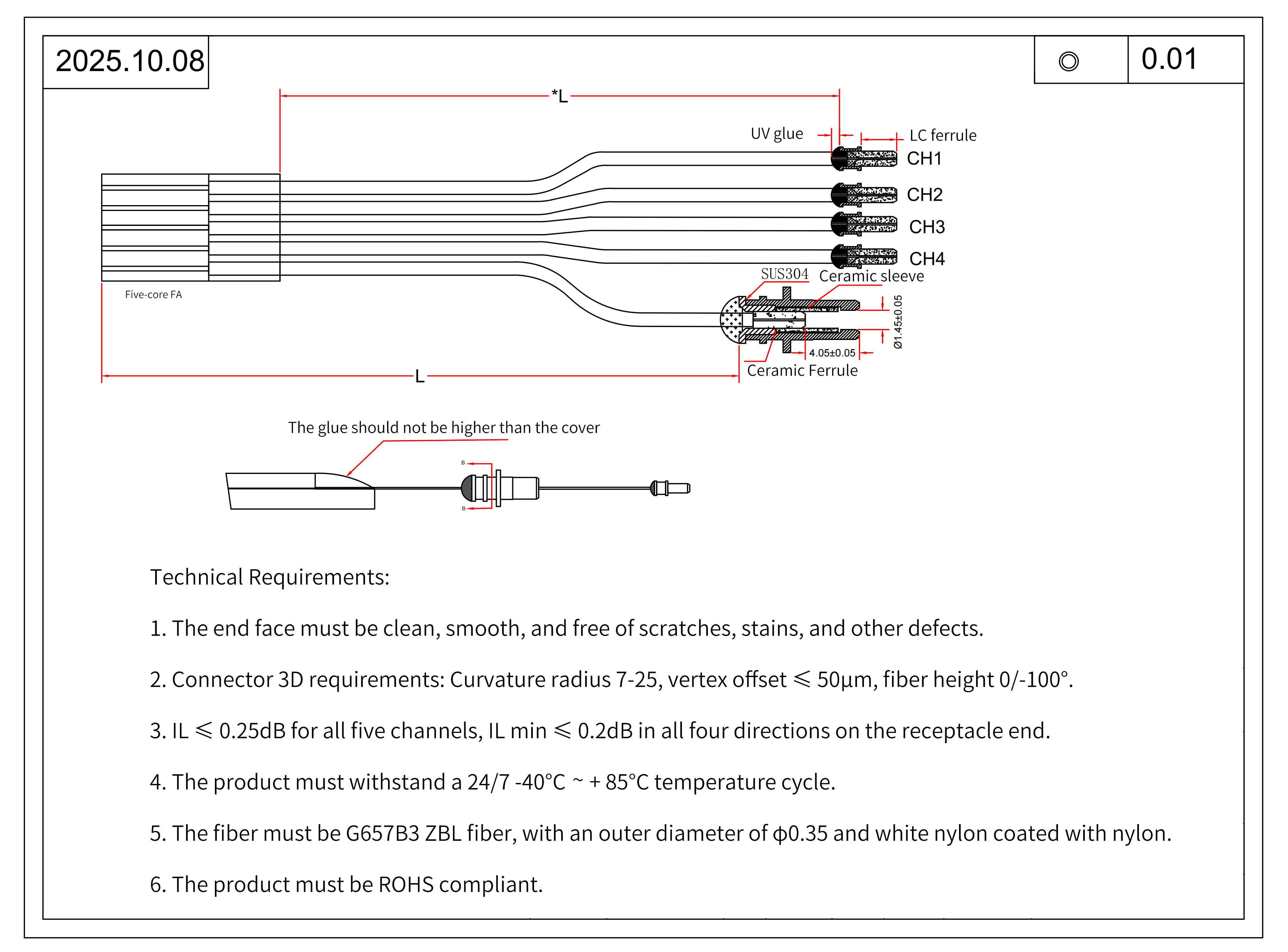 3. IL ≤ 0.25dB for all five channels, IL min ≤ 0.2dB for each of the four directions on the receptacle end.