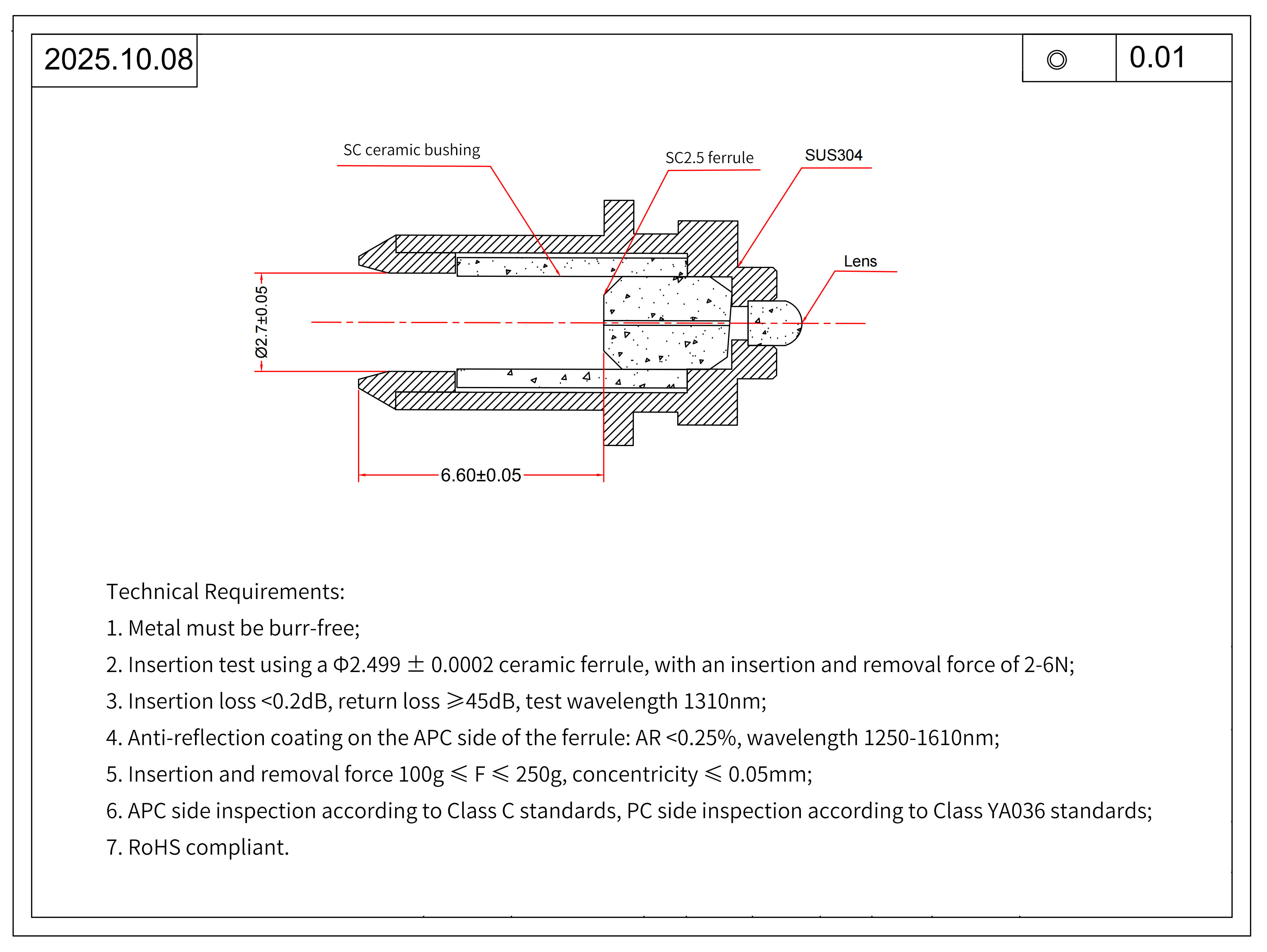 5. Insertion and removal force 100g ≤ F ≤ 250g, concentricity ≤ 0.05mm.